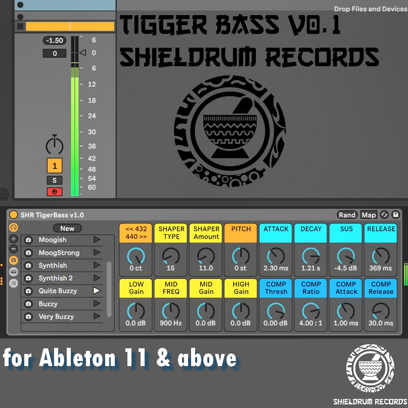 SHR TigerBass is a Ableton Instrument Rack made from the studio's Bass Guitar , with several presets to get in quick , from natural bass guitar sounds to more modern and ruff sounding bass ( for Ableton 11 & above )